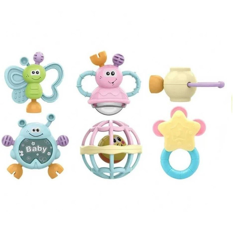شامل ۶ عدد جغجغه رنگی: تنوع رنگی بالا برای سرگرمی و تحریک حس بینایی کودک.