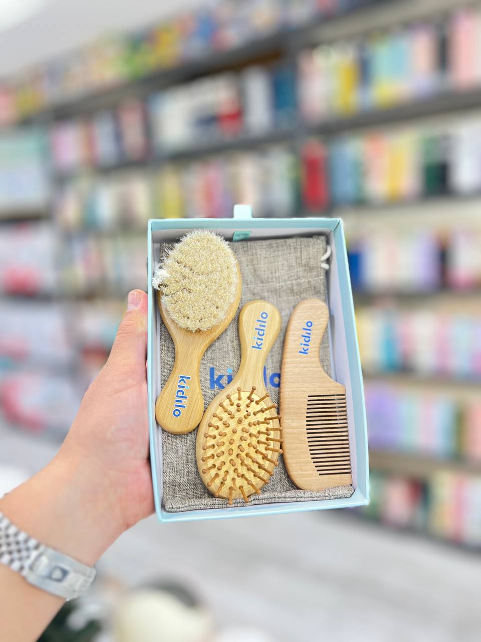 ست شانه و برس چوبی کیدیلو Kidilo، لوکسترین و طبیعیترین ست مراقبت از موی نوزاد از بدو تولد که الان با بستهبندی شیک و کیسه پارچهای در سیسمونی مانی نی موجود شد! این ست ۳ تکه شامل برس با موی طبیعی بز کوهی فوقالعاده نرم، برس ماساژور چوبی، و شانه چوبی بامبو ضدالکتریسیته است که هم پوست سر حساس نوزاد رو آروم میکنه، هم از شوره سر (کَپ) جلوگیری میکنه و هم موها رو بدون گره و الکتریسیته شانه میزنه.