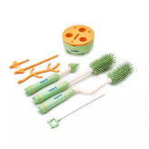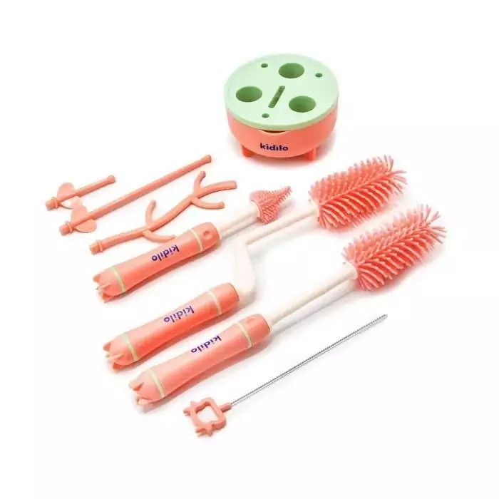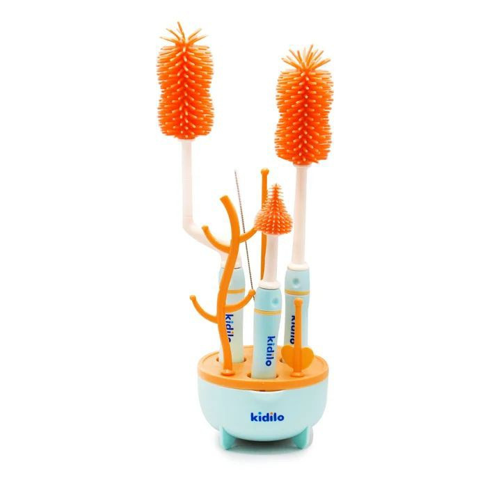 شیشه شور کیدیلو Kidilo شامل: 3 عدد فرچه سیلیکونی در ابعاد مختلف برای شستشو شیشه شیرهای گوناگون، یک عدد فرچه کوچک برای شستشو سرشیشه، 3 عدد پابه آبچکان برای شیشه شیر و سرشیشه و یک عدد پایه اصلی که تمامی وسایل بر روی آن قرار می گیرند.
