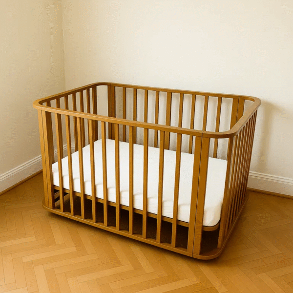 - ابعاد داخلی تخت ۱۱۰×۷۰ سانتیمتر فضای جادار برای نوزاد تا حدود ۱۲–۱۸ ماهگی – مناسب برای اکثر نوزادان ایرانی تا زمانی که شروع به ایستادن و راه رفتن کنند.