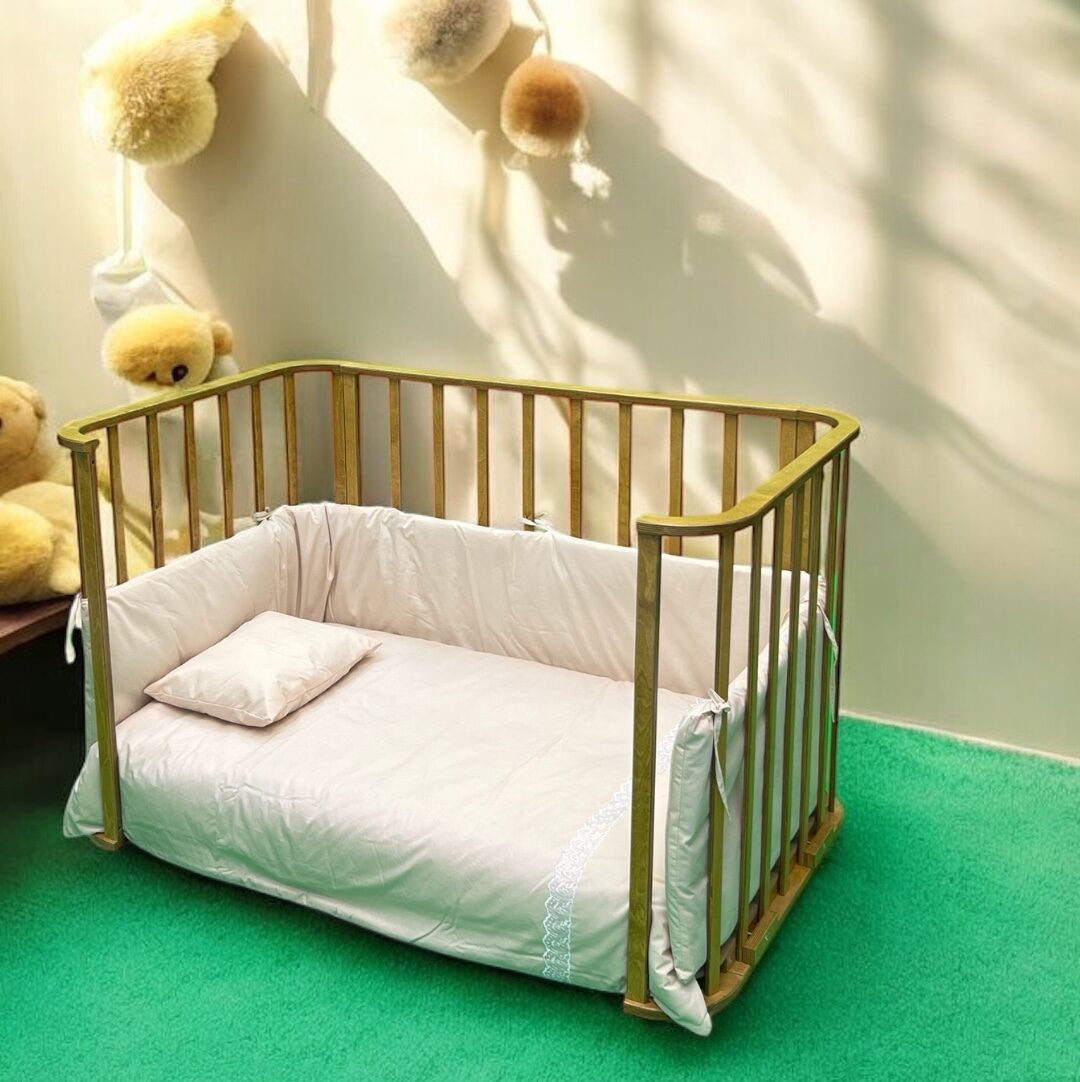 - ابعاد بیرونی تخت ۱۲۰×۷۵ سانتیمتر ابعاد خارجی مناسب برای کنار تختهای استاندارد مادر – فضای زیادی اشغال نمیکند و به راحتی در اتاق جا میشود.