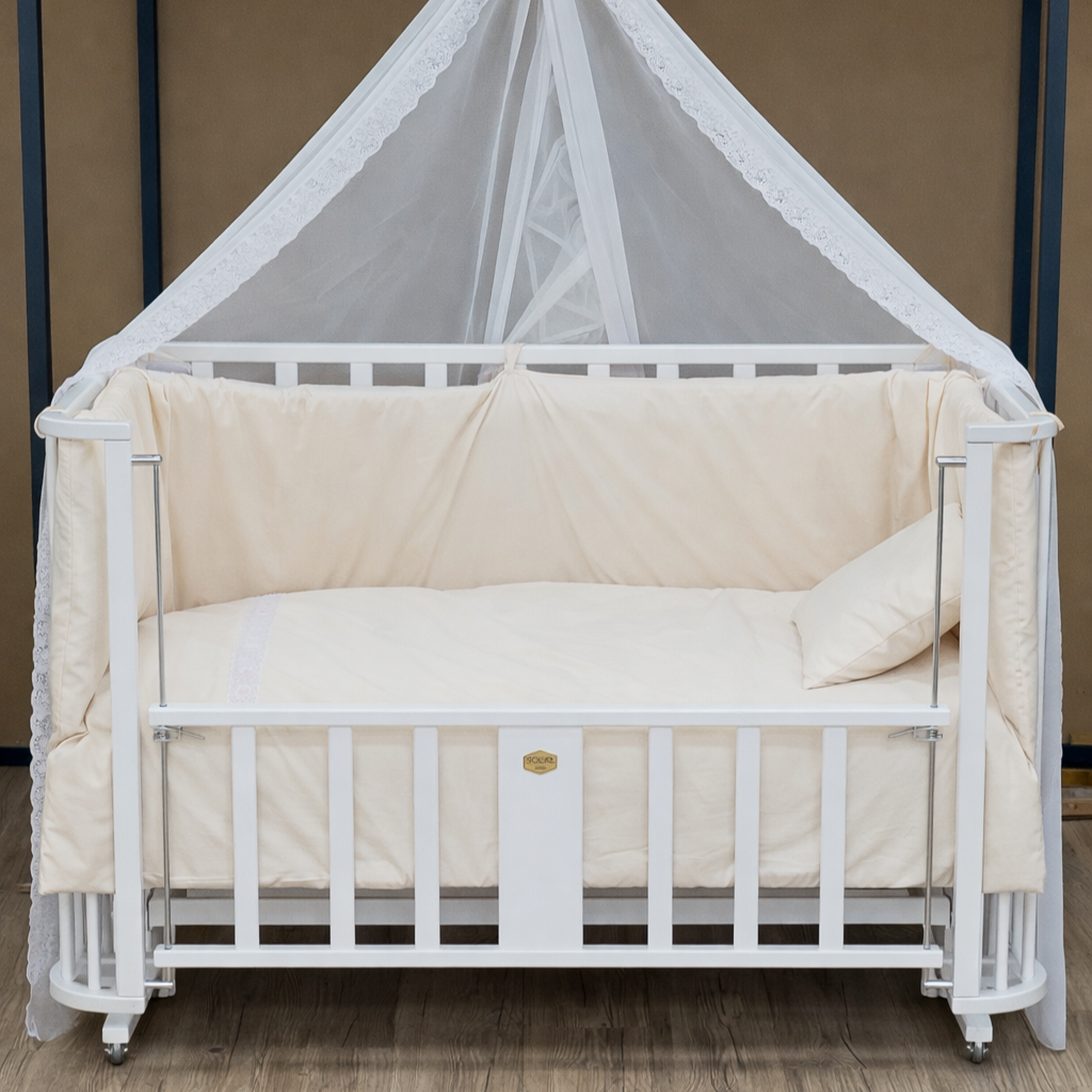 - ارتفاع قابل تنظیم چند سطح امکان تنظیم ارتفاع پایهها برای همسطح شدن دقیق با تخت مادر – مهمترین ویژگی برای شیر شبانه بدون بلند شدن.