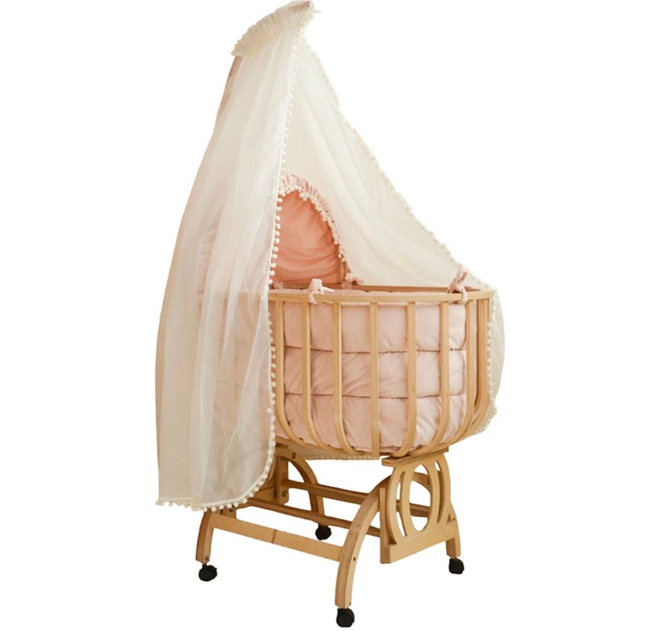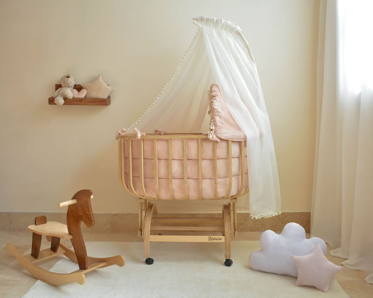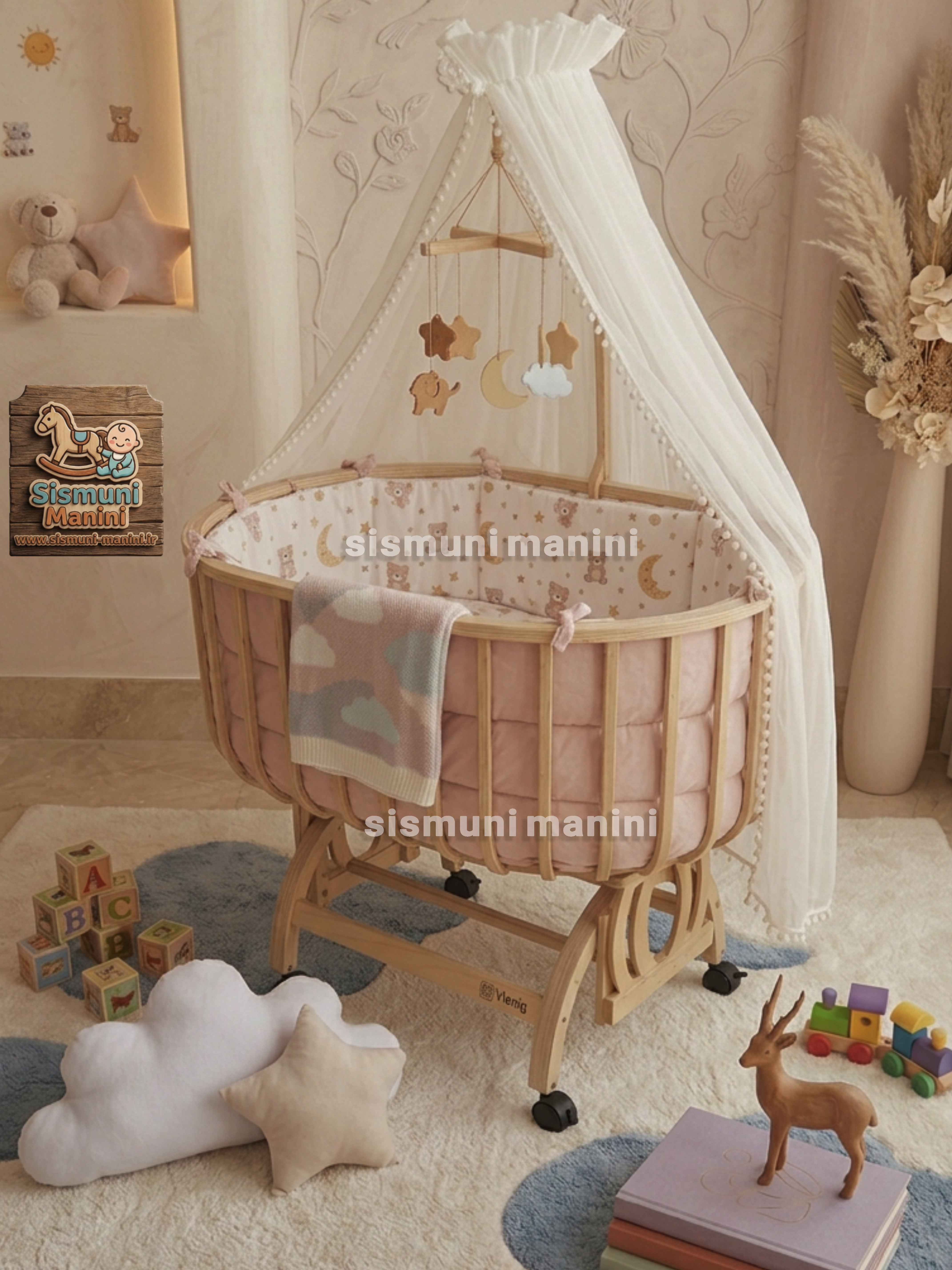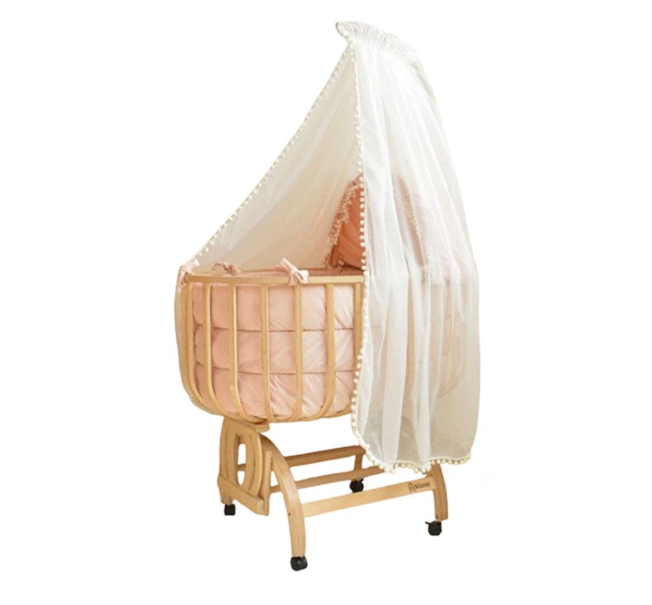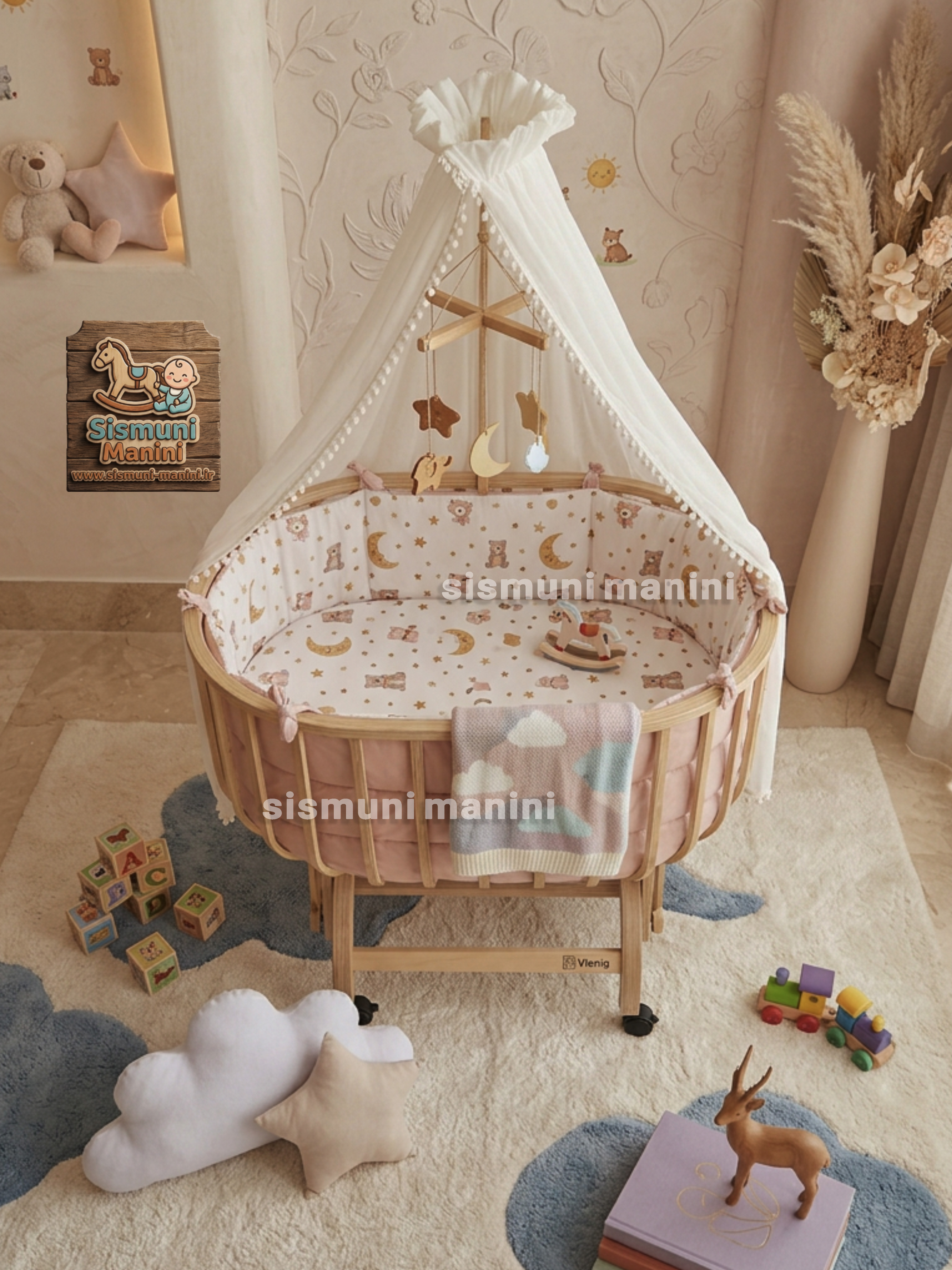 تخت و گهواره چوبی بیضی ویونا به همراه سرویس خواب و پشه بند سیسمونی مانی نی