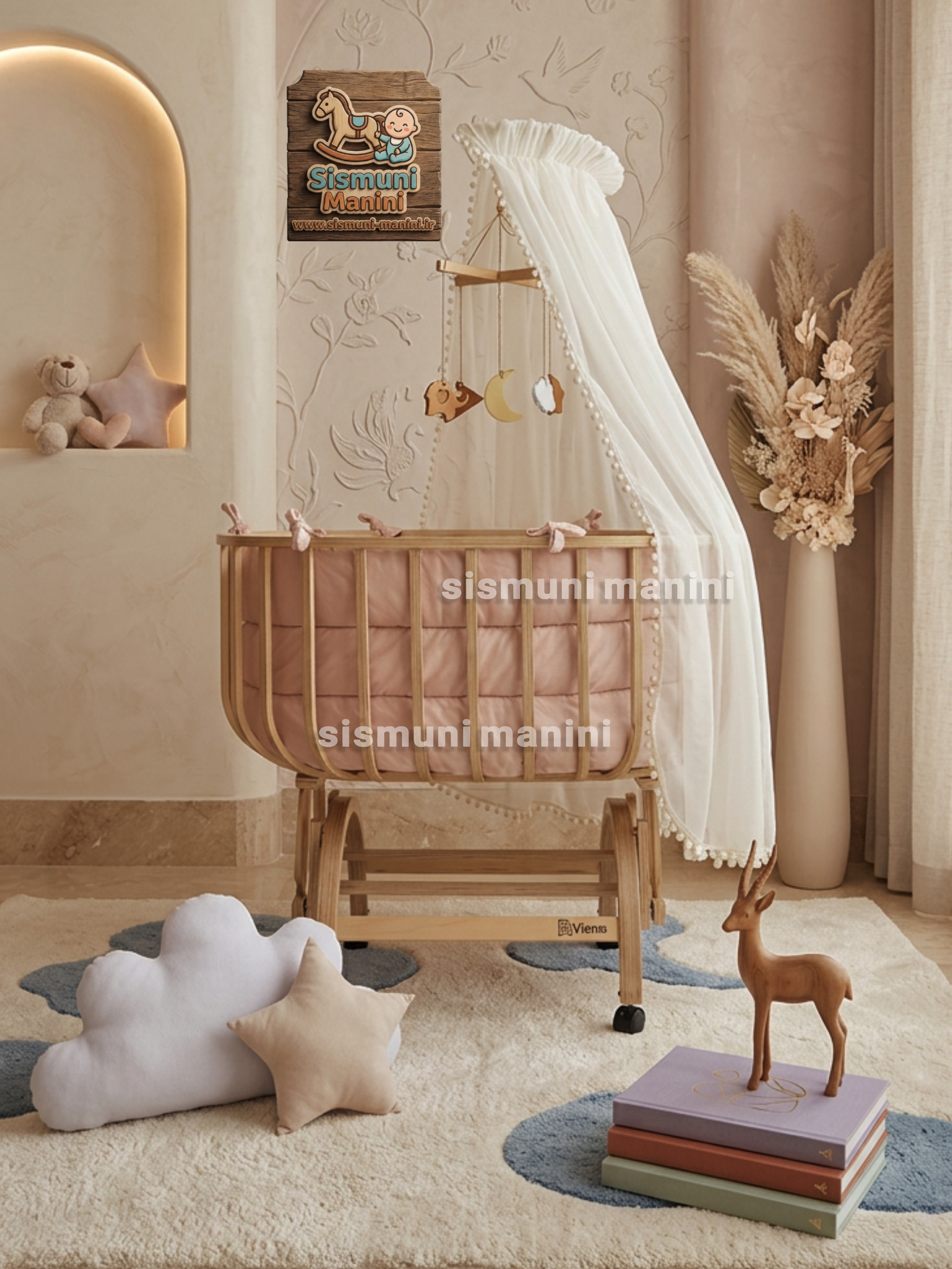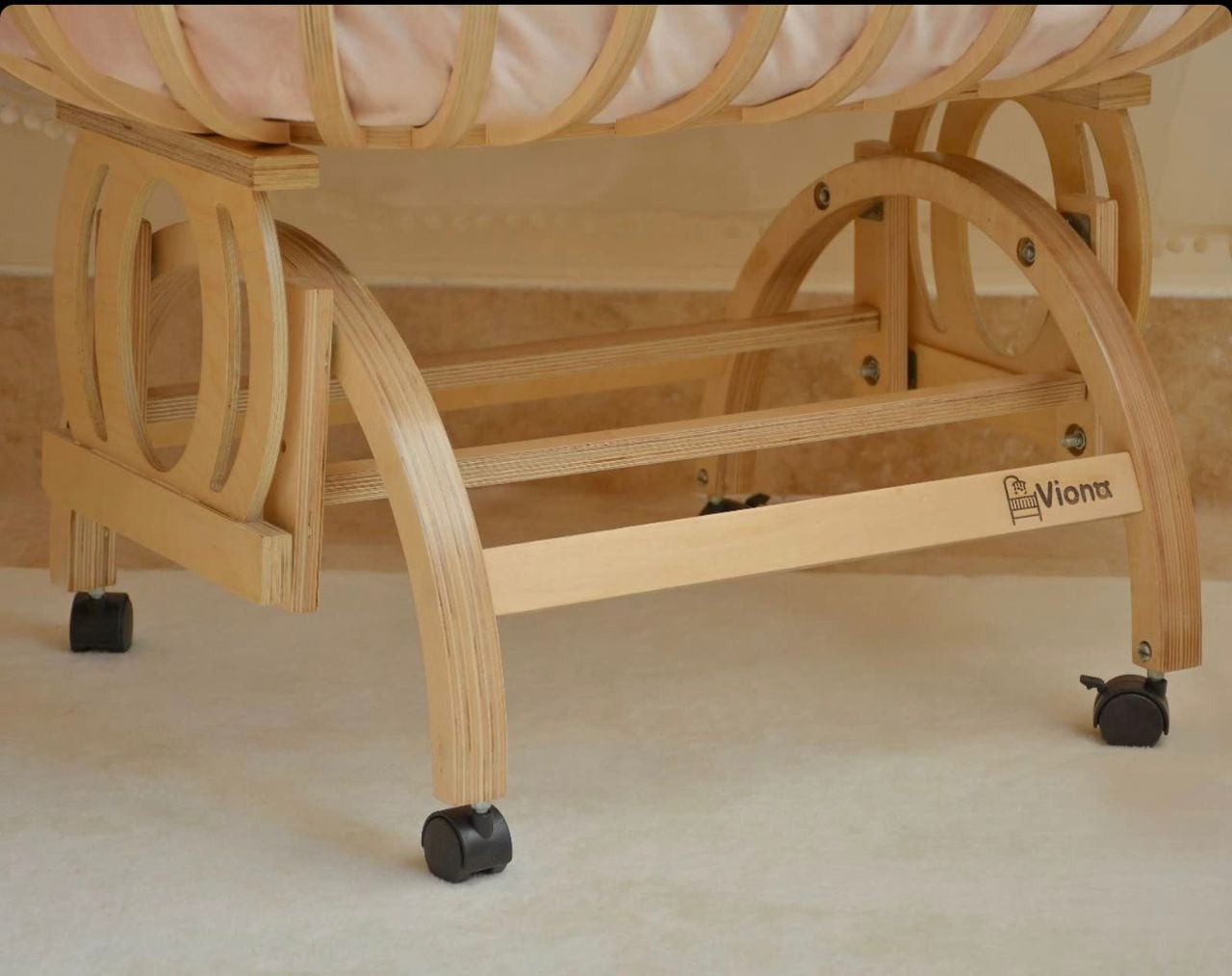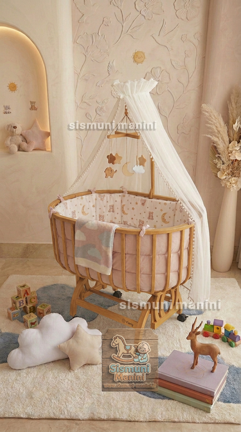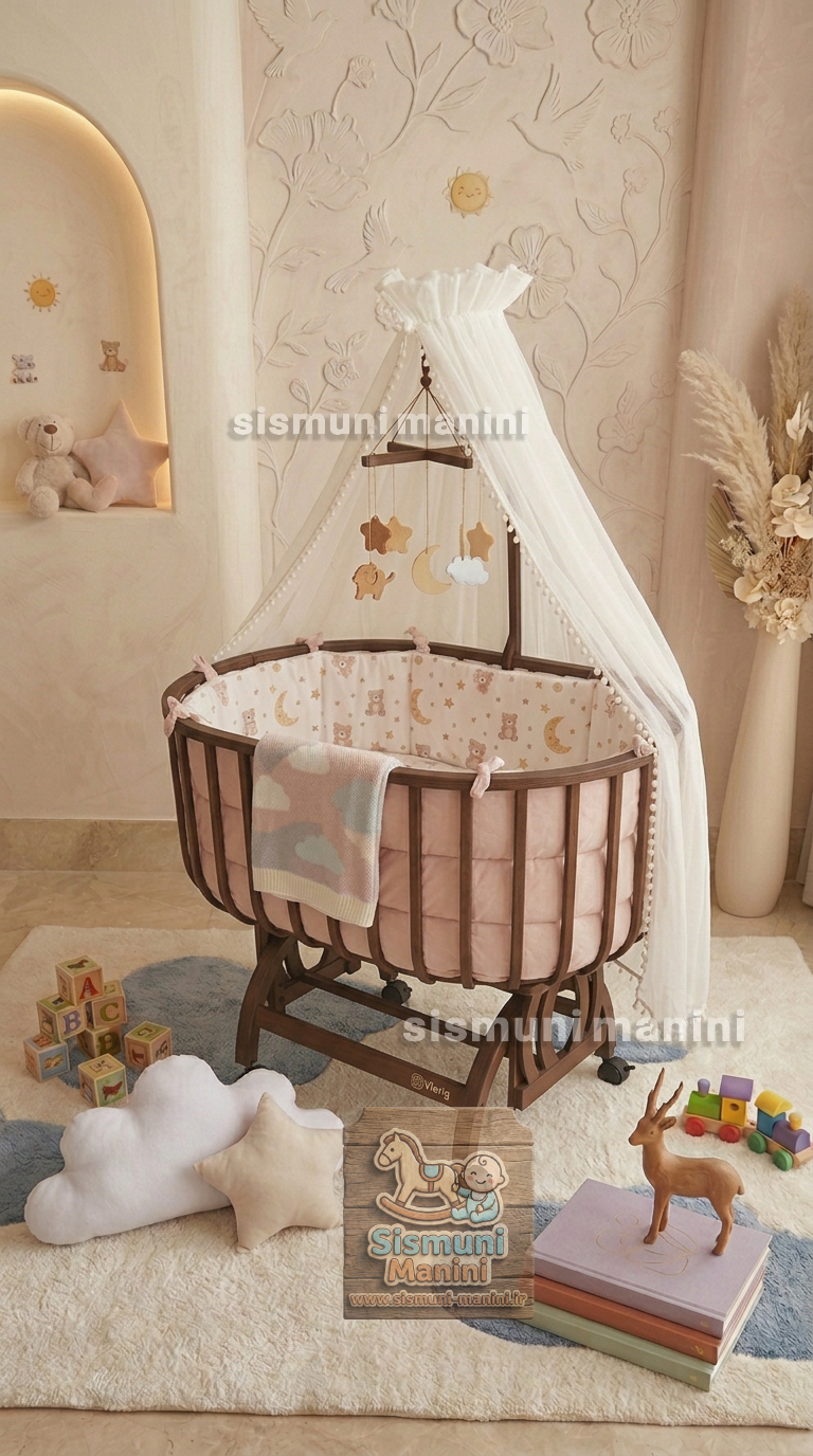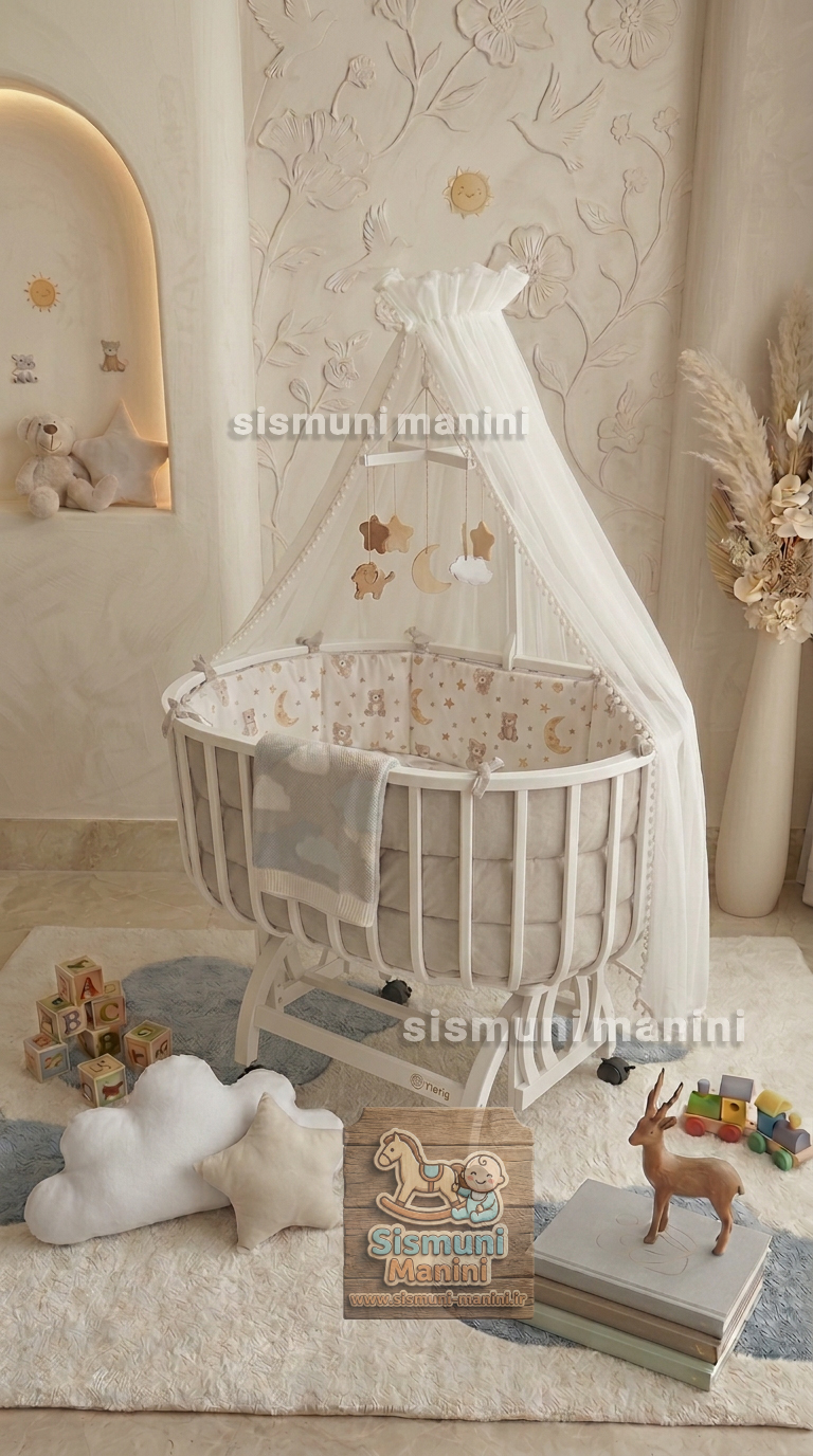 تخت و گهواره چوبی بیضی ویونا به همراه سرویس خواب و پشه بند سیسمونی مانی نی