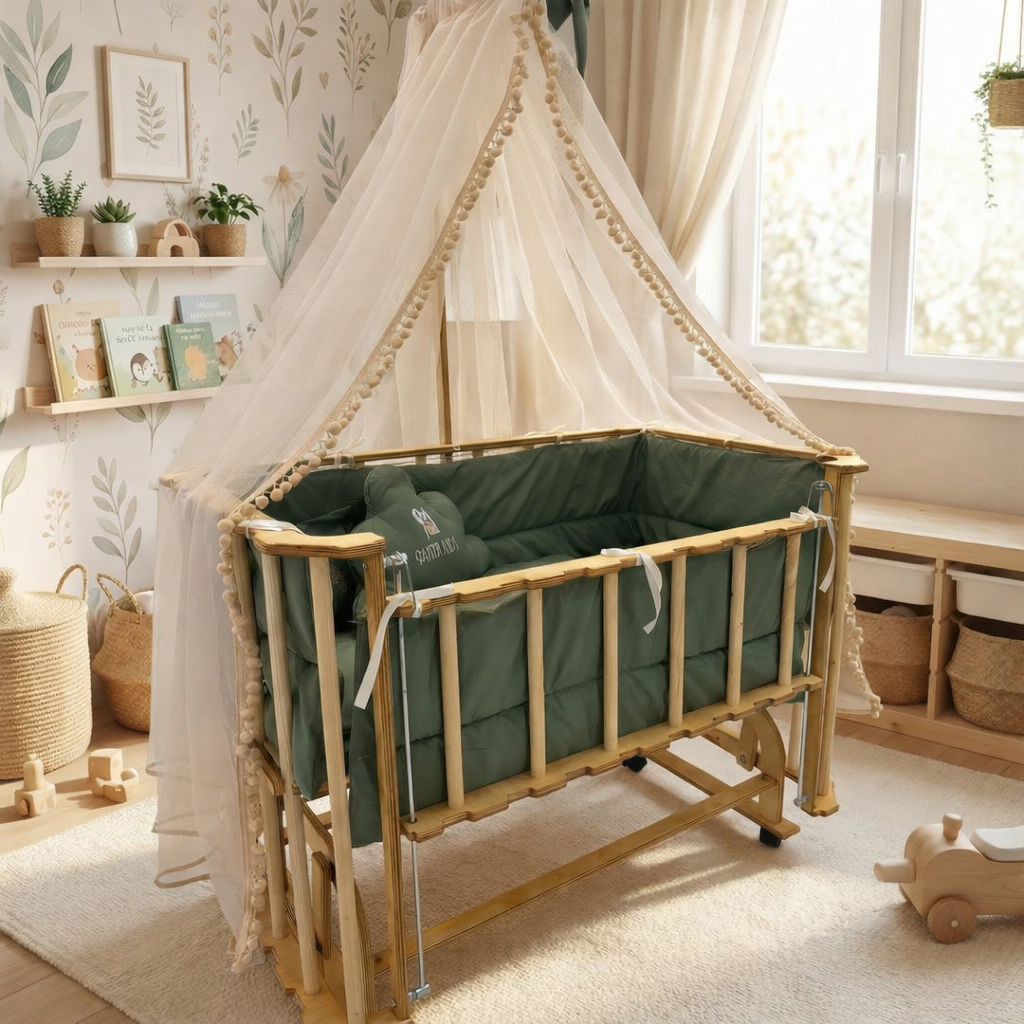 تخت و گهواره ۵۰×۹۰ درجه یک با ابعاد داخلی ۵۰×۹۰ سانتیمتر، از چوب مقاوم ساخته شده و دارای تنظیم ارتفاع، حالت گهوارهای/ثابت، چرخهای روان و پارچه داخلی نرم ضدحساسیت است. مناسب از بدو تولد تا ۱۸ ماهگی با فضای خواب جادار و ایمن. این تخت برای مادرانی که به دنبال تخت کنار مادر راحت، ایمن و درجه یک هستند، گزینهای ایدهآل است.
