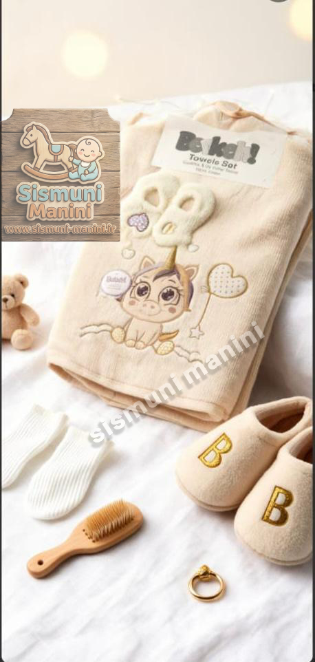 سرویس حوله پنج تیکه نوزاد برکه با طرح یونی کورن کلاه دار سیسمونی مانی نی