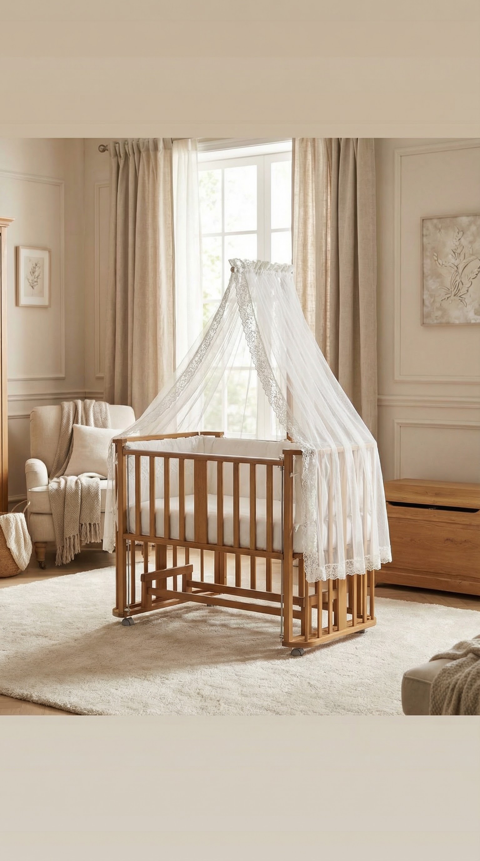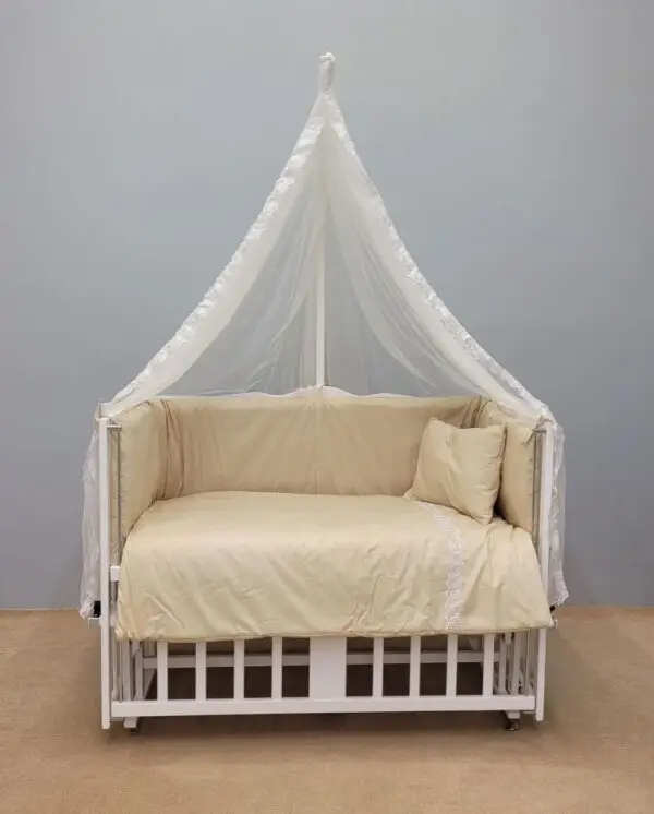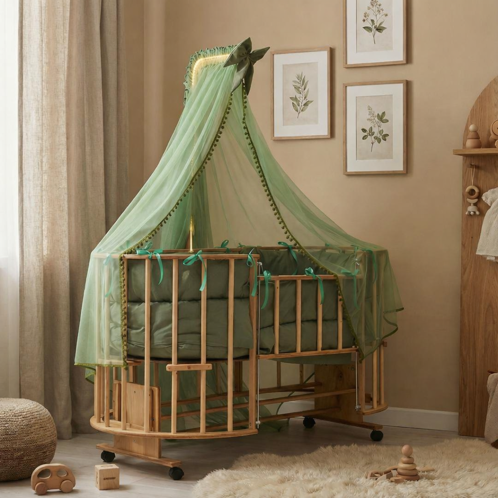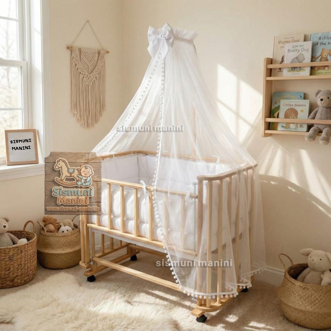 تخت و گهواره چوبی بیضی ویونا به همراه سرویس خواب و پشه بند سیسمونی مانی نی