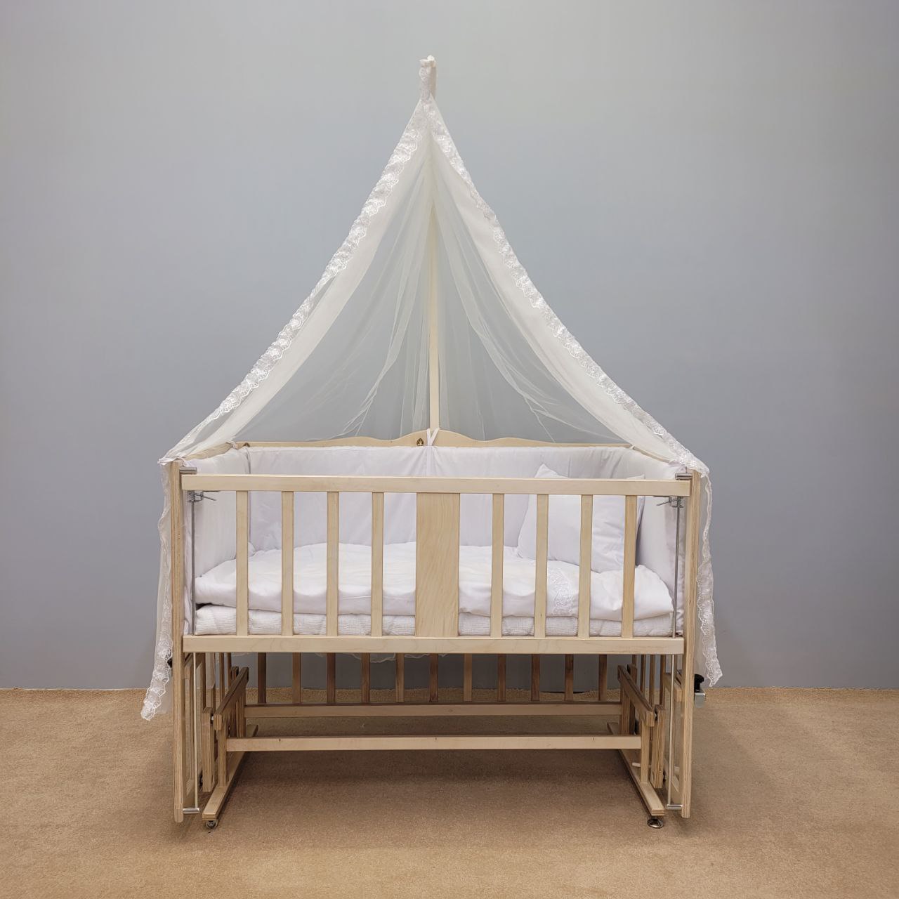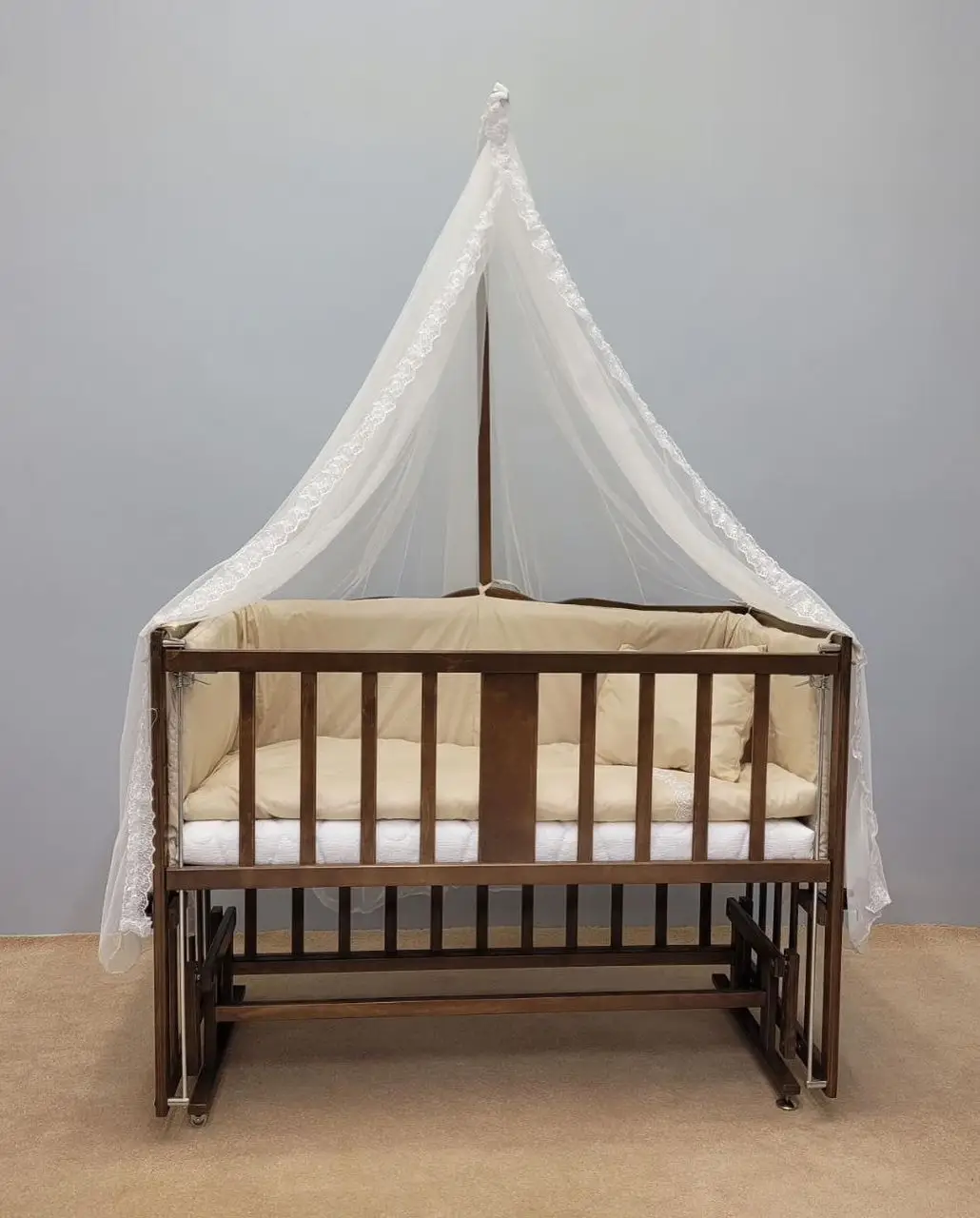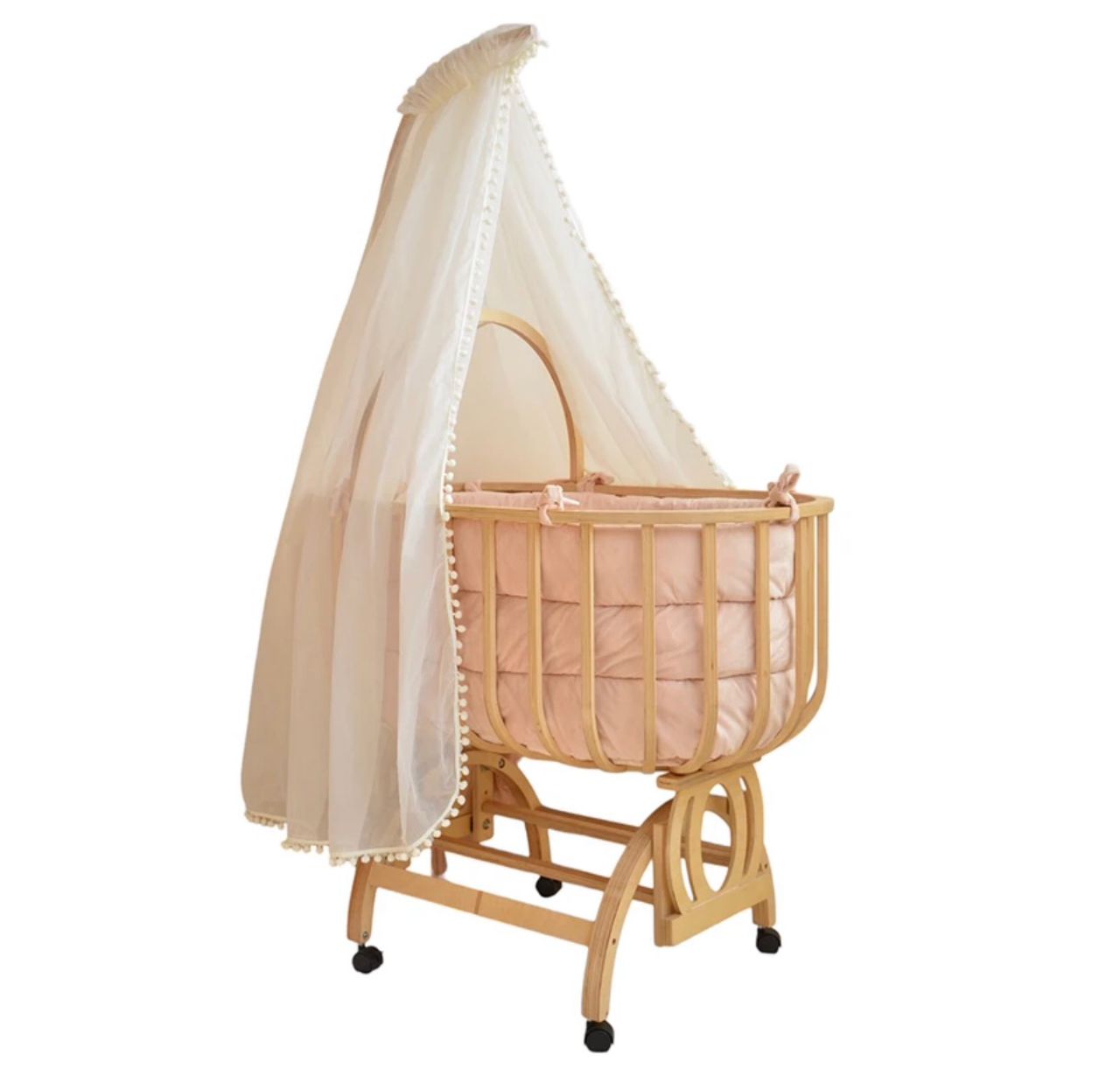 تخت و گهواره چوبی بیضی ویونا به همراه سرویس خواب و پشه بند سیسمونی مانی نی