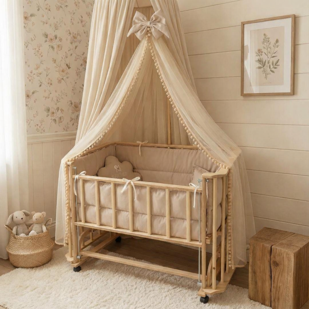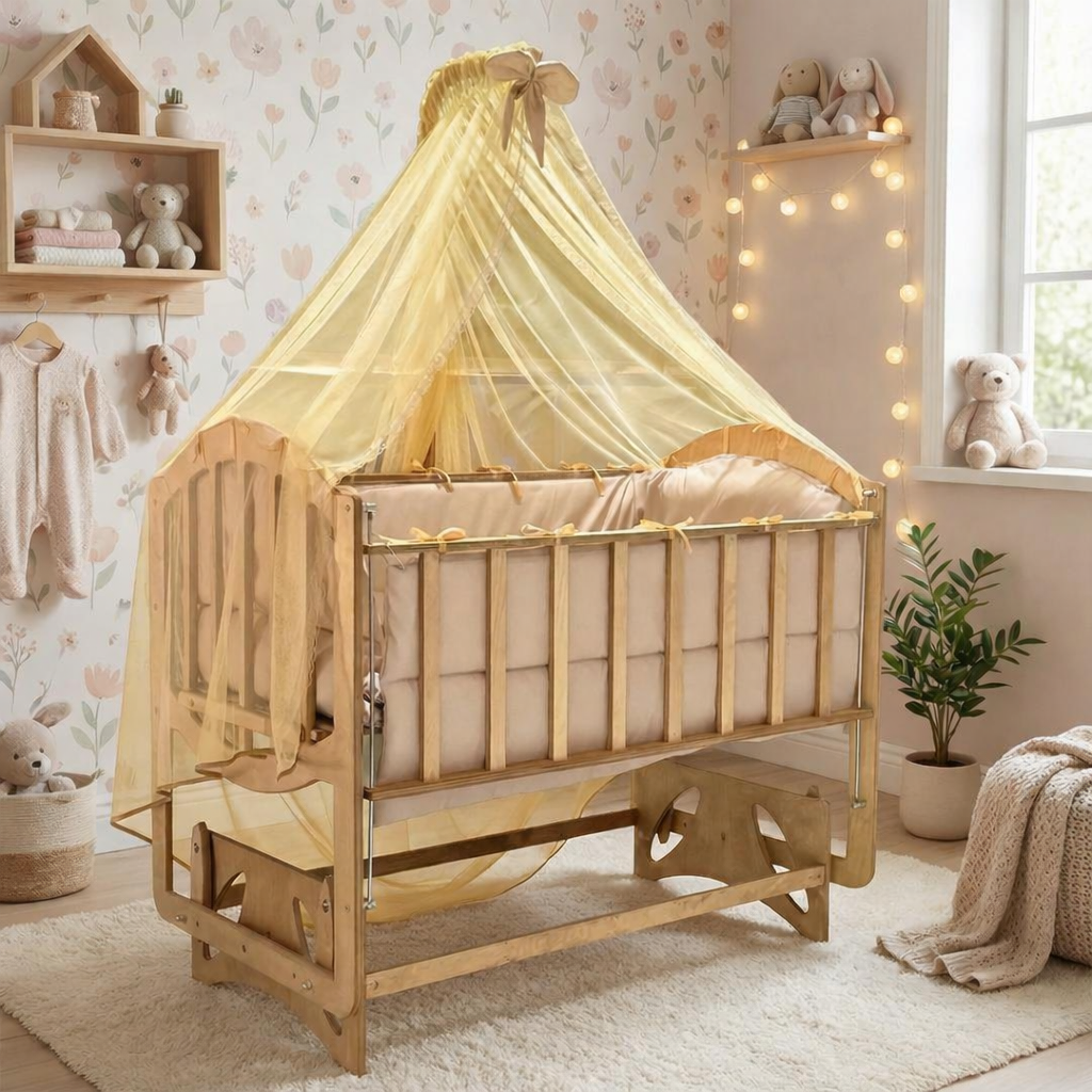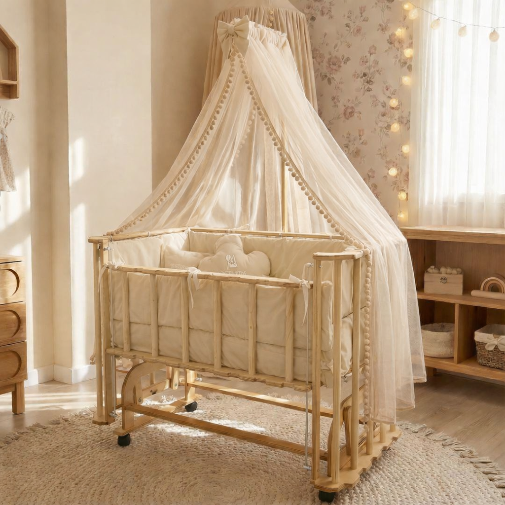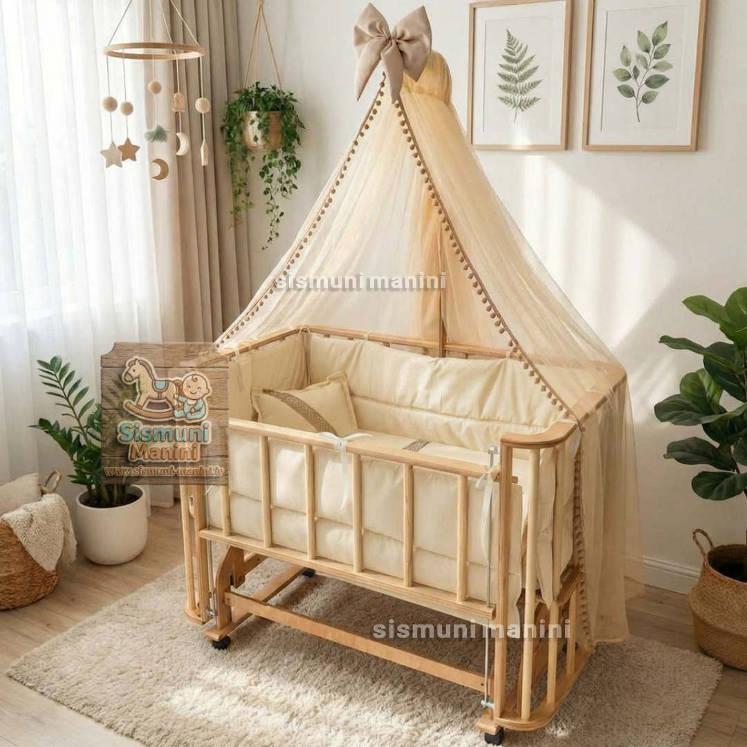 تخت و گهواره چند کاره کنار مادر چوبی طرح خاص سیسمونی مانی نی